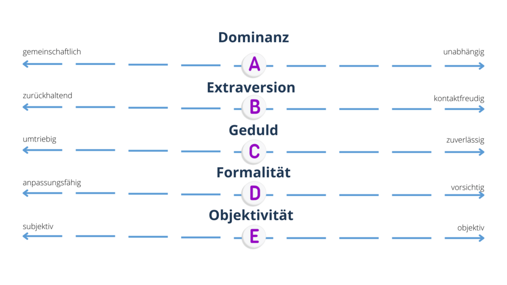 Jedes Adjektiv ist mit einem der vier Schlüsselfaktoren verbunden, die das Verhalten am Arbeitsplatz bestimmen: Dominanz, Extraversion, Geduld und Formalität.